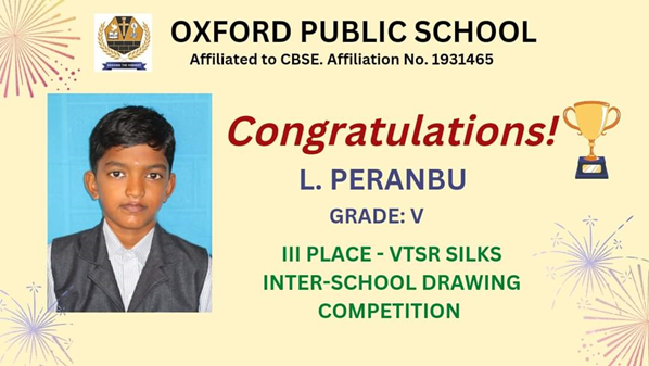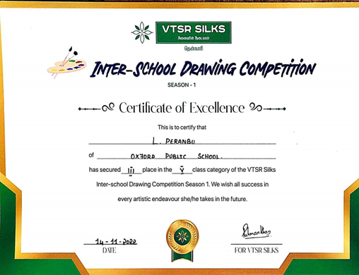 We are glad to share that our Oxfordian L. Peranbu from Grade: V, Sec: Elegant actively participated in the Inter-School Drawing Competition conducted by VTSR Silks and secured III place.