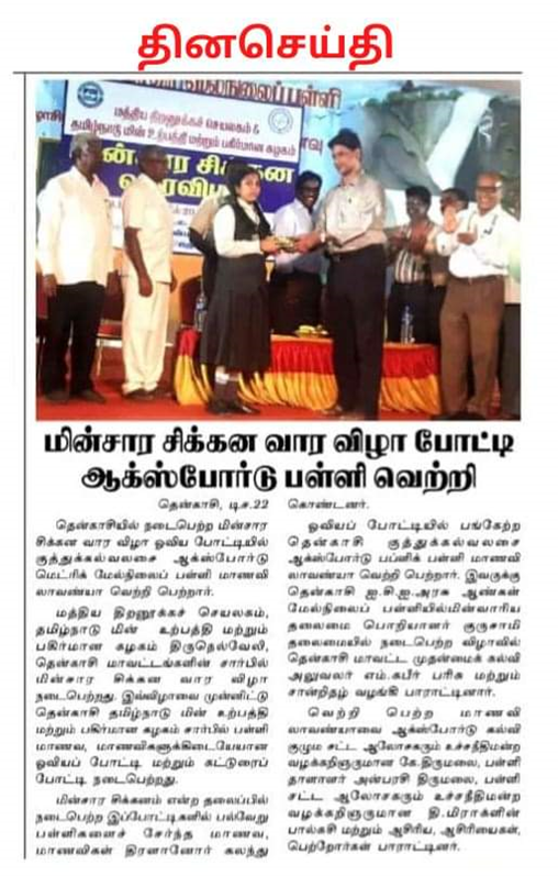 We congratulate our Oxfordian S. Lavanya, Grade: VIII for actively participating and achieving third place in the Drawing Competition conducted by Tamil Nadu Electricity Generation and Distribution Corporation. We wish her success in all her future endeavors.
