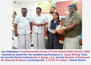 Our Oxfordian S.Amirthavarshini, Grade: VII from Oxford Public School, CBSE actively participated in the competition conducted by Indian Medicine & Homeopathy Department and received an award for her excellent performance in Essay Writing from our Hon'ble District Collector Mr. P. Akash, I.A.S, Hon'ble Member of Parliament Mr. Dhanush M. Kumar and Respected C.E.O Mr. M. Kabeer, Tenkasi District.