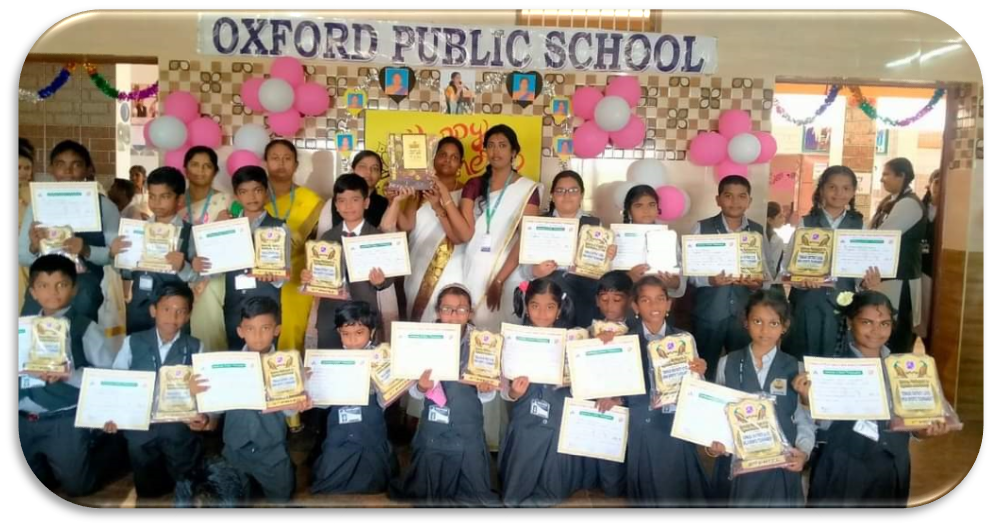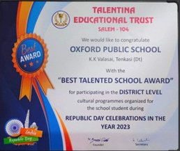 Our Oxfordians actively participated in the cultural programmes organized by the Talentina Educational Trust, Salem and won several trophies, medals and certificates. Our Oxford Public School was awarded the "BEST TALENTED SCHOOL AWARD" for the outstanding performance in all the competitions. The award was presented by our Esteemed Chief Guest Dr. N. Ramapiran Ranjith Singh B.Sc., M.L., Ph.D., Principal of Government Law College, Karaikudi to our Legal Advisors and our Secretary Ma'am.