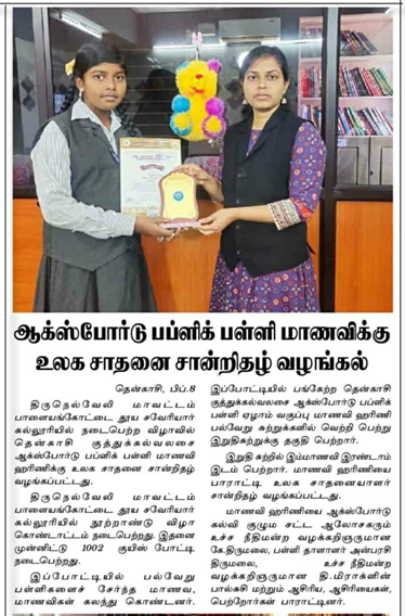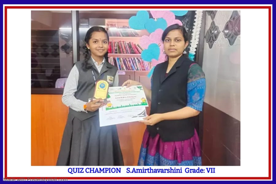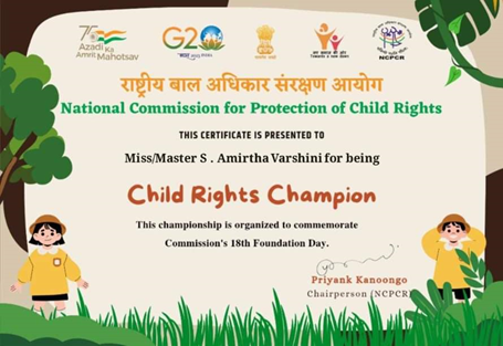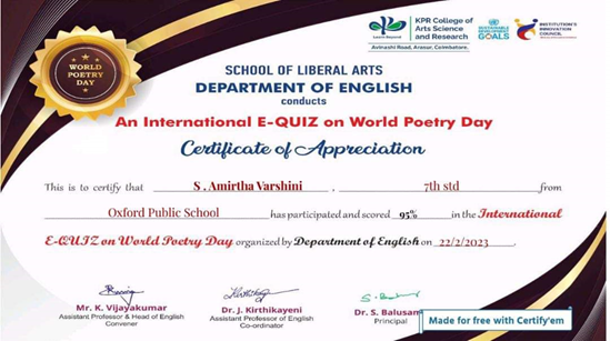 Our Oxfordian S.Amirthavarshini, Grade: VII actively participated in the quiz competition conducted by National Commission for Protection of Child Rights and she was awarded 'Child Rights Champion'. She also took part in the International quiz on world poetry day and scored 95%.