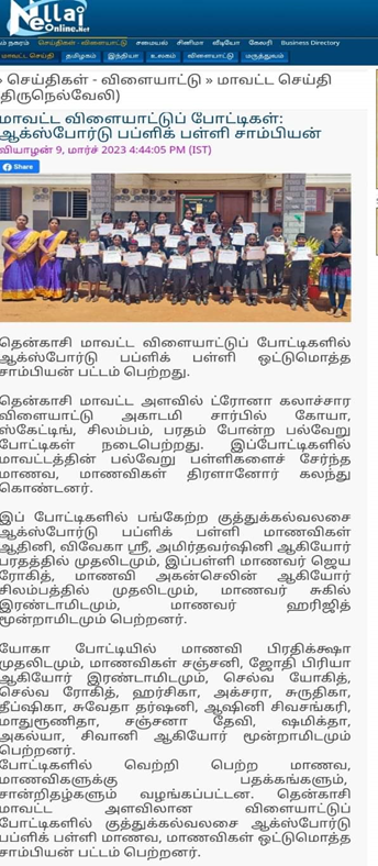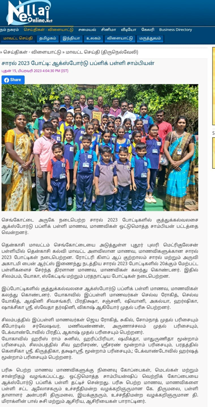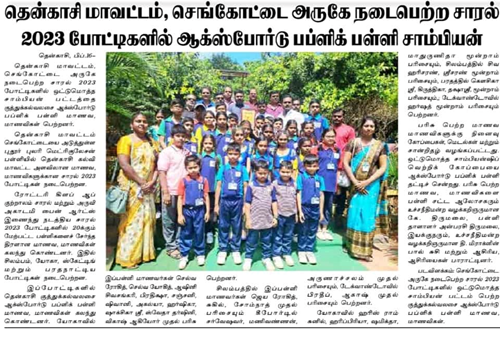 Rotary Club of Courtallam & Aruvi Academy of Fine Arts conducted District Level Chaaral-2023 competitions. Our Oxfordians actively participated in Bharatham, Yoga, Silambam, Skating, Taekwondo and Keyboard competitions and won several prizes. Our Oxfordians won the overall championship trophy.