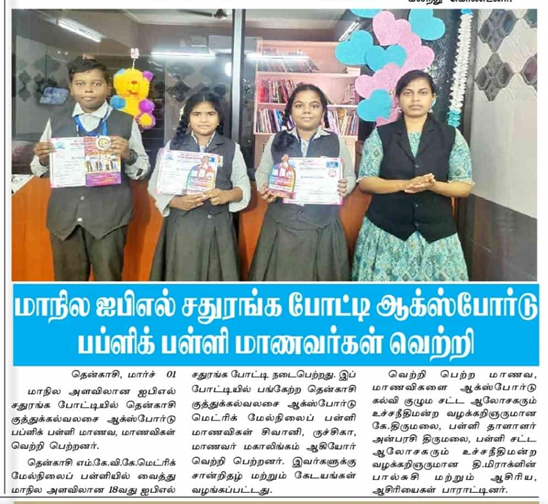 Our Oxfordians S.Sridhar - Grade III, R.Ruchika - Grade V and M.Mahalingam - Grade VIII participated in the District Level Chess Competition conducted by Tenkasi District Chess Committee and won certificates.