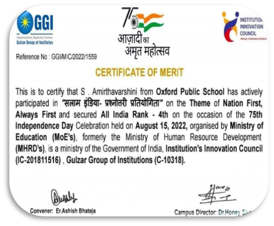 We are happy to share that our Oxfordian S. Amirthavarshini, Grade: VII from Oxford Public School, CBSE actively participated in the National Level Quiz Competition conducted by the Ministry of Education, Government of India and secured ALL INDIA RANK 4.